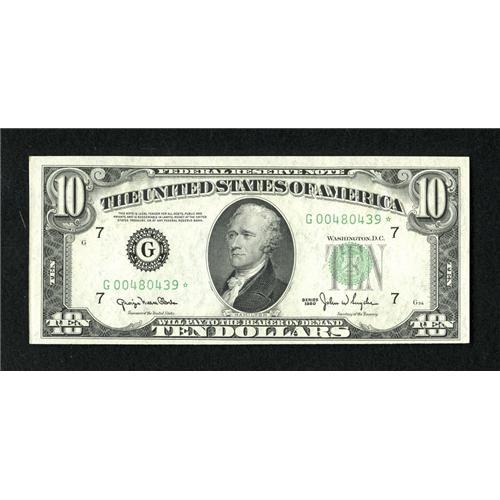 <B>Fr. 2010-G* $10 1950 Wide Federal Reserve Note. Choice Crisp Uncirculated.</B></I><BR>Three extra wide margins are found on this embossed star from an elusive series.<BR><BR><I>From The Bill and Kathy Stella Currency Collection</B></I><BR><BR><b>Shipping:</b> Coins & Currency (<a target="_blank" href="http://www.heritageauctions.com/common/shipping.php">view shipping information</a>)