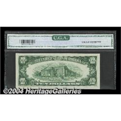 Fr. 2010-K* $10 1950 Federal Reserve Note. CGA Gem Uncirculated 67.A lovely Gem Star note from Dallas that appears to have fully earned its lofty third-party grade. <BR><BR><B>Important notice:</B> Heritage usually auctions material at the rate of 200-250 lots per hour. On some occasions eBay Live bid software or the Internet may not be able to keep up with the pace of the auction. We recommend placing a realistic absentee bid now as insurance to avoid disappointment. Occasionally the auctioneer may eliminate or reject an eBay Live bid, and the auctioneer may also reopen a lot after the close of the eBay live bidding (usually because we missed an audience bid), and may reject your bid even if it shows you as the winning bidder. By bidding via eBay Live, you agree that Heritage may award the lot to another bidder at its sole discretion under the circumstances described above or any other reasonable circumstances. Since eBay bids are not shown to us until we open the lot on the floor, we treat those bids just like floor bids. In most cases the floor responds before the eBay bid is presented to us, due to Internet lag time, so for consistency we have made it a policy that floor bids are always considered first over tie eBay live bids. Also please note that all Heritage lots purchased through eBay Live carry a 20% Buyer's Premium. Please make sure you read the Terms and Conditions before you bid. <BR><BR><B>IMPORTANT ANNOUNCEMENT ABOUT RESERVES:</B> Heritage now divulges all reserves on its web site 7 days before every auction. If you want to know whether the reserve on this lot has been met, and if not, what the reserve amount is, please visit this lot page on the HeritageCoin.com web site, or email: bid@HeritageGalleries.com