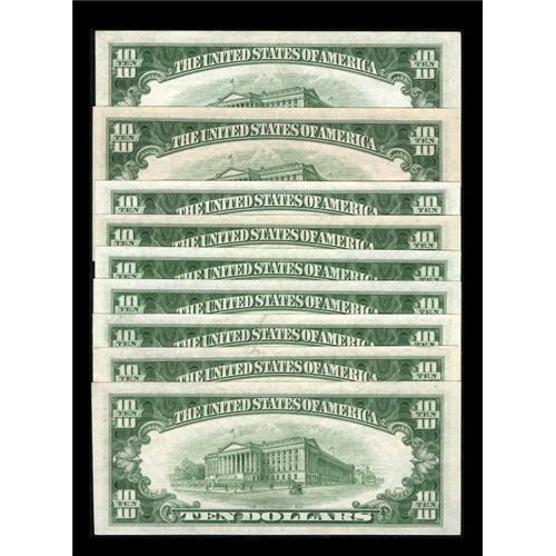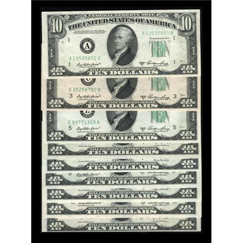 <B>Fr. 2011-A; C; E; F; G; I; J; K; L $10 1950A Federal Reserve Note. Crisp Uncirculated or Better.</B></I><BR> Nine districts are represented in this partial district set for the 1950A series. Many of these notes have enough nice centering to achieve choice status.<BR><I>From The Thomas M. Flynn Collection</B></I><BR><BR><b>Shipping:</b> Coins & Currency (<a target="_blank" href="http://www.heritageauctions.com/common/shipping.php">view shipping information</a>)