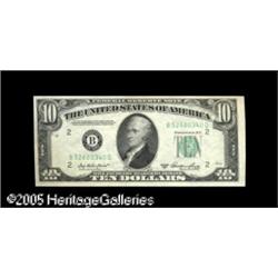 <B>Fr. 2011-B $10 1950A Federal Reserve Note/$1 Silver Certificate Double Denomination Choice Crisp Uncirculated.</B></I> With the exception of the unique small size National Bank Note double denomination also offered as part of this collection, this is the rarest of the small size double denominations, and unquestionably the most romantic. Printed in early 1955, these were released in the New York metropolitan area, with this piece being found in northern New Jersey. Error specialist Harry Jones has estimated that only about a half dozen of these pieces have survived, and, of that number, this is unquestionably the finest. This example is crackling fresh, perfectly centered, and shows only the most minute traces of handling. It is considerably nicer than either the Levitan piece, which sold for $30,800, or the specimen which sold at Stack's this past month. Since its discovery in 1955, this note has had only two owners, the family of the individual who discovered it then, and the owner of the Taylor Family collection. Any collector would be honored to have the opportunity to become the third. Lot:15480