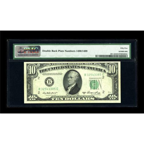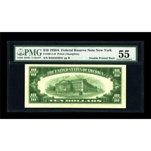 <B>Fr. 2011-B $10 1950A Federal Reserve Note. PMG About Uncirculated 55.</B></I><BR> Doubled back printing affects this early $10 FRN. Both Back Plate number 1490 & 1499 are noticed.<BR><BR><b>Shipping:</b> Coins & Currency (<a target="_blank" href="http://www.heritageauctions.com/common/shipping.php">view shipping information</a>)