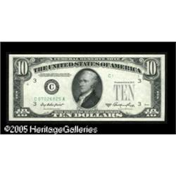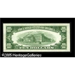 <B>Fr. 2011-C $10 1950A Federal Reserve Note. Gem New.</B></I><BR>The right-hand serial number is very heavily embossed, but only the prefix letter and half of the suffix letter have printed--the remaining portion being blocked by an obstruction. Lot:15355