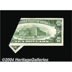Fr. 2011-E* $10 1950A Federal Reserve Note. Extremely Fine. A neat foldover error on any note, but prohibitively rare as a star not, and the only example from this series we've seen. There is a bit of wallet soil on the left side of the front. Our estimate here may well prove conservative. <BR><BR><B>Important notice:</B> Heritage usually auctions material at the rate of 200-250 lots per hour. On some occasions eBay Live bid software or the Internet may not be able to keep up with the pace of the auction. We recommend placing a realistic absentee bid now as insurance to avoid disappointment. Occasionally the auctioneer may eliminate or reject an eBay Live bid, and the auctioneer may also reopen a lot after the close of the eBay live bidding (usually because we missed an audience bid), and may reject your bid even if it shows you as the winning bidder. By bidding via eBay Live, you agree that Heritage may award the lot to another bidder at its sole discretion under the circumstances described above or any other reasonable circumstances. Since eBay bids are not shown to us until we open the lot on the floor, we treat those bids just like floor bids. In most cases the floor responds before the eBay bid is presented to us, due to Internet lag time, so for consistency we have made it a policy that floor bids are always considered first over tie eBay live bids. Also please note that all Heritage lots purchased through eBay Live carry a 20% Buyer's Premium. Please make sure you read the Terms and Conditions before you bid. <BR><BR><B>IMPORTANT ANNOUNCEMENT ABOUT RESERVES:</B> Heritage now divulges all reserves on its web site 7 days before every auction. If you want to know whether the reserve on this lot has been met, and if not, what the reserve amount is, please visit this lot page on the HeritageCoin.com web site, or email: bid@HeritageGalleries.com