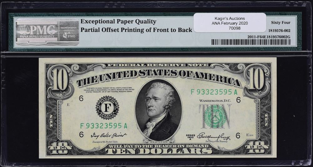 Fr. 2011-F. 1950A $10 Federal Reserve Note Error. PMG Choice Uncirculated 64 EPQ.
