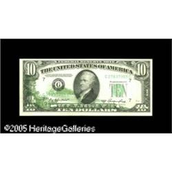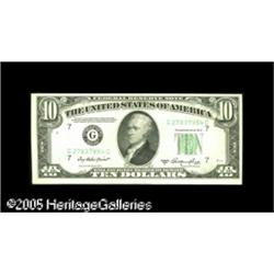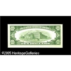 <B>Fr. 2011-G $10 1950A Federal Reserve Notes. Choice New.</B></I><BR>Two consecutive notes: one with a large blank area on the back and the second bearing the identically shaped back-to-face offset caused by whatever obstructed the printing of the first note. A neat and most unusual pair that last auction for just under $1,000. 2 notes Lot:15329