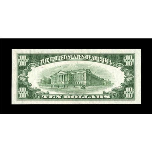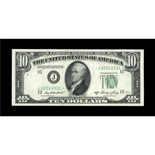 <B>Fr. 2011-J* $10 1950A Federal Reserve Note. Choice Crisp Uncirculated.</B></I><BR>Ample margins are found on this pack fresh KC star that has the third printing shifted to the right enough so that the "*" is just outside the scrollwork. A minor counting pinch at upper right is mentioned for cataloging accuracy.<BR><BR><b>Shipping:</b> Coins & Currency (<a target="_blank" href="http://www.heritageauctions.com/common/shipping.php">view shipping information</a>)