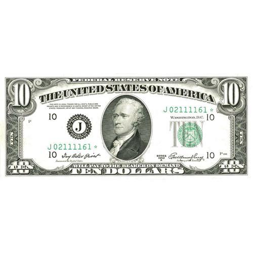 <B>Fr. 2011-J* $10 1950A Federal Reserve Note. Gem Crisp Uncirculated.</B></I><BR>A perfectly centered and utterly flawless star which might be equalled but will never be surpassed.