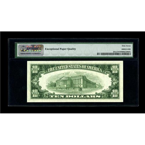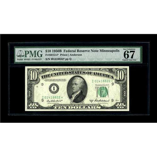<B>Fr. 2012-I* $10 1950B Federal Reserve Note. PMG Superb Gem Unc 67EPQ.</B></I><BR>For the serious collector who desires to combine rarity with quality this is the note to take home. Four behemoth margins are complemented by cavernous embossing and superb aesthetic appeal. With a printing well under one million, the Minneapolis star is certainly the key to this series.<BR><BR><b>Shipping:</b> Coin/Currency (<a target="_blank" href="http://www.heritageauctions.com/common/shipping.php">view shipping information</a>)