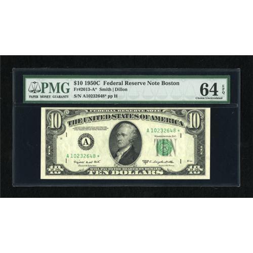 <B>Fr. 2013-A* $10 1950C Federal Reserve Note. PMG Choice Uncirculated 64 EPQ.</B></I><BR> A crisp and crackling fresh example of this very scarce star which lists in Schwartz for $300 in CU.<BR><BR><b>Shipping:</b> Coins & Currency (<a target="_blank" href="http://www.heritageauctions.com/common/shipping.php">view shipping information</a>)