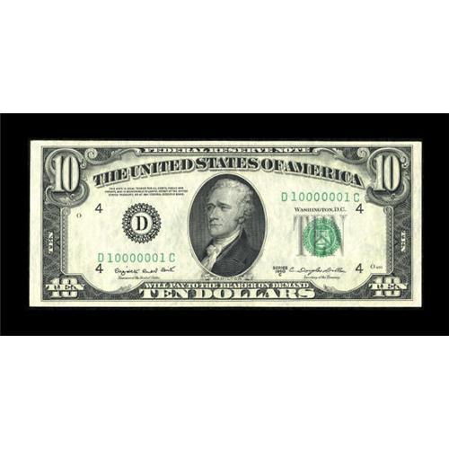 <B>Fr. 2013-D $10 1950C Federal Reserve Note. Gem Crisp Uncirculated.</B></I><BR> This pristine example bears the ultimate radar serial number D10000001C.<BR><I>From The Thomas M. Flynn Collection</B></I><BR><BR><b>Shipping:</b> Coins & Currency (<a target="_blank" href="http://www.heritageauctions.com/common/shipping.php">view shipping information</a>)