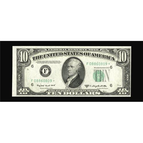 <B>Fr. 2013-F* $10 1950C Federal Reserve Note. Choice Crisp Uncirculated.</B></I><BR>Gem paper surfaces, but kept from that grade by a left to right centering shift.