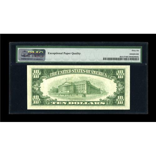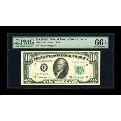 <B>Fr. 2013-F* $10 1950C Federal Reserve Note. PMG Gem Uncirculated 66 EPQ.</B></I><BR>The margins on this issue are near perfect, and is consecutive to the next lot.<BR><BR><b>Shipping:</b> Coins & Currency (<a target="_blank" href="http://www.heritageauctions.com/common/shipping.php">view shipping information</a>)