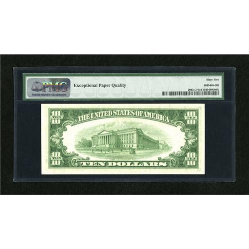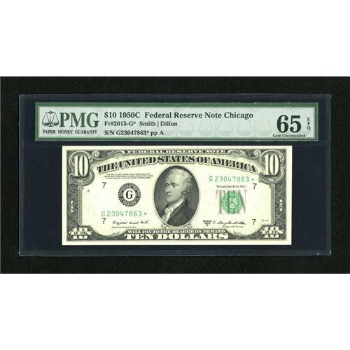 <B>Fr. 2013-G* $10 1950C Federal Reserve Note. PMG Gem Uncirculated 65 EPQ.</B></I><BR>Great punch through embossing and broad margins are seen on this Chicago star.<BR><I>From The Bill and Kathy Stella Currency Collection</B></I><BR><BR><b>Shipping:</b> Coins & Currency (<a target="_blank" href="http://www.heritageauctions.com/common/shipping.php">view shipping information</a>)