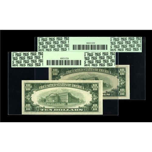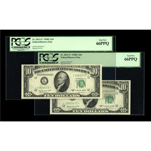<B>Fr. 2013-L* $10 1950C Federal Reserve Notes. Two Examples. PCGS Gem New 66PPQ.</B></I><BR>We have had very few of this Friedberg number over the years. The originality of these notes that are separated by one serial number is seen through the third-party holders.<BR><BR><b>Shipping:</b> Coins & Currency (<a target="_blank" href="http://www.heritageauctions.com/common/shipping.php">view shipping information</a>)