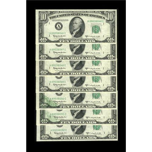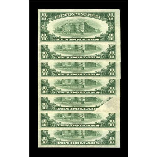 <B>Fr. 2014-A $10 1950D Federal Reserve Notes. Seven Consecutive Examples Choice Crisp Uncirculated.</B></I><BR>This lot contains a note with an obstructed reverse with two bookends before, one after, then two consecutive partial back to face offsets matching the obstruction and another bookend. All the notes are pack fresh and crisp.