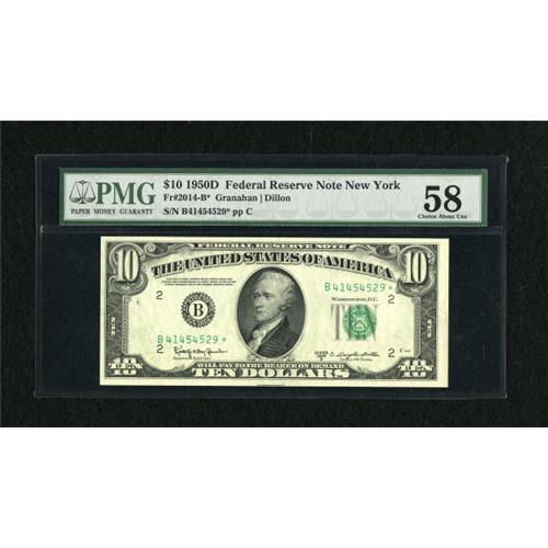 <B>Fr. 2014-B* $10 1950D Federal Reserve Note. PMG Choice About Unc 58.</B></I><BR> A lightly handled replacement from the New York district.<BR><BR><b>Shipping:</b> Coins & Currency (<a target="_blank" href="http://www.heritageauctions.com/common/shipping.php">view shipping information</a>)
