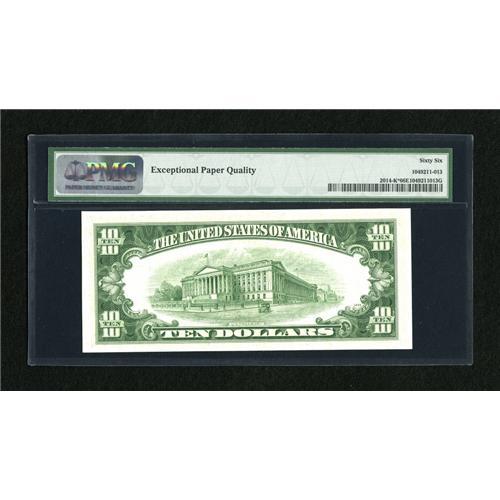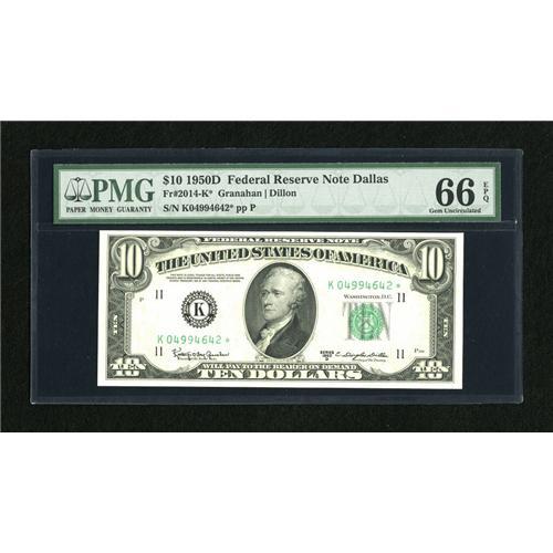 <B>Fr. 2014-K* $10 1950D Federal Reserve Note. PMG Gem Uncirculated 66 EPQ.</B></I><BR>This near-Superb issue boasts perfectly original and bright white paper.<BR><BR><b>Shipping:</b> Coins & Currency (<a target="_blank" href="http://www.heritageauctions.com/common/shipping.php">view shipping information</a>)