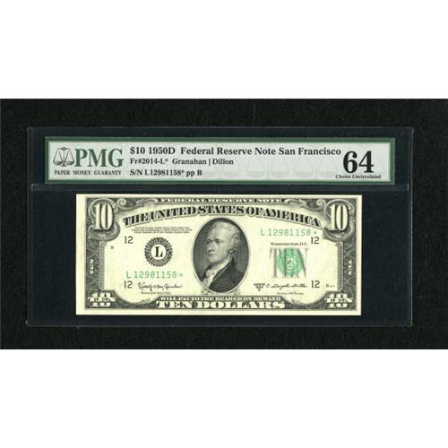 <B>Fr. 2014-L* $10 1950D Federal Reserve Note. PMG Choice Uncirculated 64.</B></I><BR> Earlier replacement notes this nice simply do not turn up often as most exhibit folds and handling.<BR><BR><b>Shipping:</b> Coins & Currency (<a target="_blank" href="http://www.heritageauctions.com/common/shipping.php">view shipping information</a>)