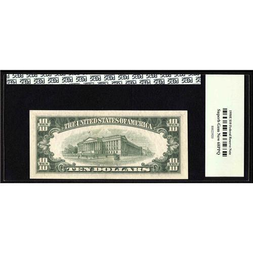 <B>Fr. 2015-G $10 1950E Federal Reserve Note. PCGS Superb Gem New 68PPQ.</B></I><BR>Near perfection, this could absolutely be the nicest example of this series witnessed by your cataloguer. The margins are as large as one could possibly imagine, the embossing is razor sharp and the centering and print quality are perfect. This block lists for a paltry $100 in Oakes, but for a note of this magnitude you can bet that it will realize far above that.