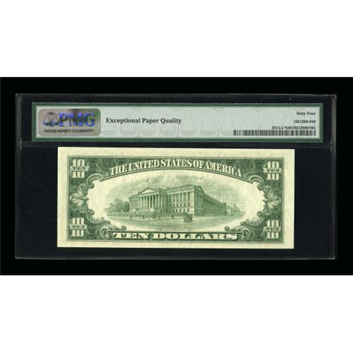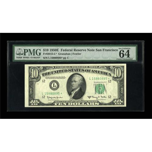 <B>Fr. 2015-L* $10 1950E Federal Reserve Note. PMG Choice Uncirculated 64 EPQ.</B></I><BR> The San Francisco replacement issue is the lowest print run for the series. Plenty of deep embossing is noticed.<BR><BR><b>Shipping:</b> Coins & Currency (<a target="_blank" href="http://www.heritageauctions.com/common/shipping.php">view shipping information</a>)