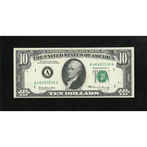 <B>Fr. 2018-A $10 1969 Federal Reserve Note. Crisp Uncirculated.</B></I><BR> An almost complete face to back offset is noticed on this Boston $10 note.<BR><BR><b>Shipping:</b> Coins & Currency (<a target="_blank" href="http://www.heritageauctions.com/common/shipping.php">view shipping information</a>)