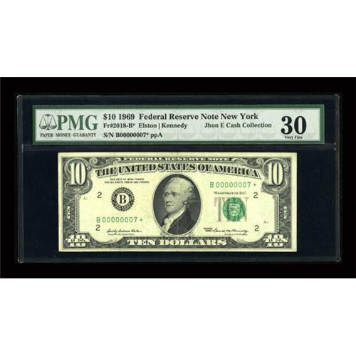 <B>Fr. 2018-B* $10 1969 Federal Reserve Note. PMG Very Fine 30.</B></I><BR> With the exception of very recent series, promoted to collectors by the BEP, low serial numbered stars are very scarce. This Serial Number 7 is no exception. It is an attractive mid-grade issue that is wholly original.<BR><BR><b>Shipping:</b> Coins & Currency (<a target="_blank" href="http://www.heritageauctions.com/common/shipping.php">view shipping information</a>)