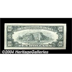 Fr. 2018-D $10 1969 Federal Reserve Note. Gem Crisp Uncirculated. A rich green offset of the back fully covers the front of this crackling fresh FRN from Cleveland, providing a most distinctive appearance. <BR><BR><B>Important notice:</B> Heritage usually auctions material at the rate of 200-250 lots per hour. On some occasions eBay Live bid software or the Internet may not be able to keep up with the pace of the auction. We recommend placing a realistic absentee bid now as insurance to avoid disappointment. Occasionally the auctioneer may eliminate or reject an eBay Live bid, and the auctioneer may also reopen a lot after the close of the eBay live bidding (usually because we missed an audience bid), and may reject your bid even if it shows you as the winning bidder. By bidding via eBay Live, you agree that Heritage may award the lot to another bidder at its sole discretion under the circumstances described above or any other reasonable circumstances. Since eBay bids are not shown to us until we open the lot on the floor, we treat those bids just like floor bids. In most cases the floor responds before the eBay bid is presented to us, due to Internet lag time, so for consistency we have made it a policy that floor bids are always considered first over tie eBay live bids. Also please note that all Heritage lots purchased through eBay Live carry a 20% Buyer's Premium. Please make sure you read the Terms and Conditions before you bid. <BR><BR><B>IMPORTANT ANNOUNCEMENT ABOUT RESERVES:</B> Heritage now divulges all reserves on its web site 7 days before every auction. If you want to know whether the reserve on this lot has been met, and if not, what the reserve amount is, please visit this lot page on the HeritageCoin.com web site, or email: bid@HeritageGalleries.com