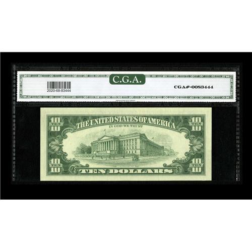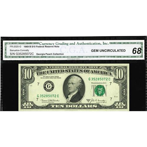 <B>Fr. 2020-G $10 1969B Federal Reserve Note. CGA Gem Uncirculated 68.</B></I><BR>Here is another Georgia Peach note that has broad margins and excellent centering.