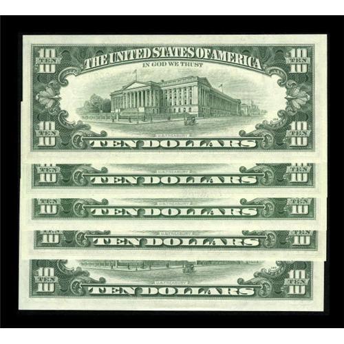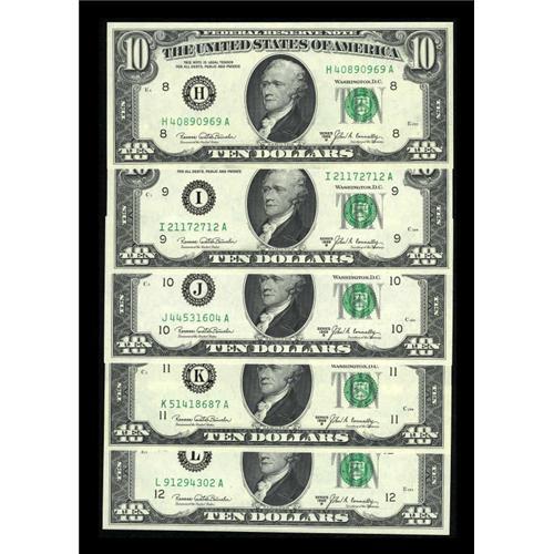 <B>Fr. 2020-H; I; J; K; L $10 1969B Federal Reserve Notes. Choice Crisp Uncirculated.</B></I><BR> The last five districts from this challenging series are included with this lot. All five pieces are nicely embossed and a couple of the notes have enough centering to reach gem status.<BR><I>From The Thomas M. Flynn Collection</B></I><BR><BR><b>Shipping:</b> Coins & Currency (<a target="_blank" href="http://www.heritageauctions.com/common/shipping.php">view shipping information</a>)