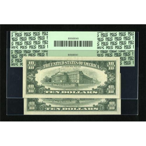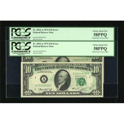 <B>Fr. 2022-A $10 1974 Federal Reserve Notes. Two Examples PCGS Choice About New 58PPQ.</B></I><BR> A most pleasing pair of notes each exhibiting a light partial back to front offset.<BR><BR><b>Shipping:</b> Coins & Currency (<a target="_blank" href="http://www.heritageauctions.com/common/shipping.php">view shipping information</a>)