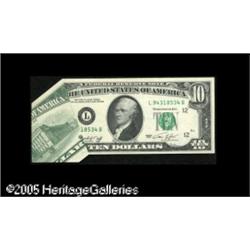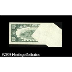 <B>Fr. 2022-L $10 1974 Federal Reserve Note. Choice New.</B></I><BR>A single diagonal fold has caused a dramatic printing and cutting error with a large blank portion on the back and the corresponding portion of the back on the front. Lot:15285