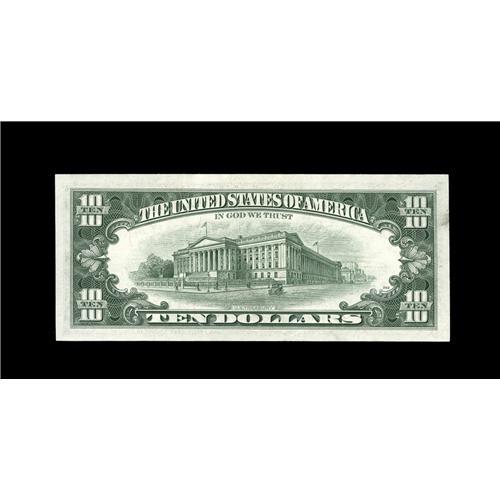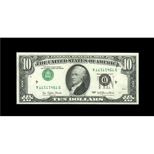 <B>Fr. 2023-D $10 1977 Federal Reserve Note. Choice Crisp Uncirculated.</B></I><BR>This Type I inverted third printing certainly is eye catching. The margins are decent with plenty of embossing present.