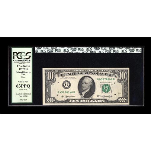 <B>Fr. 2023-G $10 1977 Federal Reserve Note. PCGS Choice New 63PPQ.</B></I><BR>This note totally bypassed the first printing giving a 100% Blank Back. Another fantastic collectable thanks to our friends at the BEP.