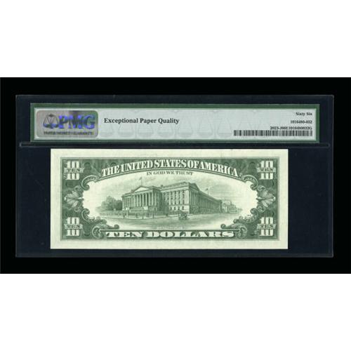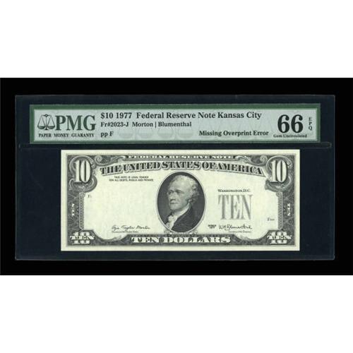 <B>Fr. 2023-J $10 1977 Federal Reserve Note. PMG Gem Uncirculated 66 EPQ.</B></I><BR> The third printing was totally missed on this early $10 Fed.<BR><BR><b>Shipping:</b> Coins & Currency (<a target="_blank" href="http://www.heritageauctions.com/common/shipping.php">view shipping information</a>)