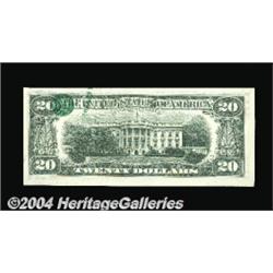 Fr. 2023-K $20 1977 Federal Reserve Note. Gem Crisp Uncirculated. Another unusual foldover error, this with a bit of green third printing on the front, more on the back foldover, and an offset serial number on the reverse as well. <BR><BR><B>Important notice:</B> Heritage usually auctions material at the rate of 200-250 lots per hour. On some occasions eBay Live bid software or the Internet may not be able to keep up with the pace of the auction. We recommend placing a realistic absentee bid now as insurance to avoid disappointment. Occasionally the auctioneer may eliminate or reject an eBay Live bid, and the auctioneer may also reopen a lot after the close of the eBay live bidding (usually because we missed an audience bid), and may reject your bid even if it shows you as the winning bidder. By bidding via eBay Live, you agree that Heritage may award the lot to another bidder at its sole discretion under the circumstances described above or any other reasonable circumstances. Since eBay bids are not shown to us until we open the lot on the floor, we treat those bids just like floor bids. In most cases the floor responds before the eBay bid is presented to us, due to Internet lag time, so for consistency we have made it a policy that floor bids are always considered first over tie eBay live bids. Also please note that all Heritage lots purchased through eBay Live carry a 20% Buyer's Premium. Please make sure you read the Terms and Conditions before you bid. <BR><BR><B>IMPORTANT ANNOUNCEMENT ABOUT RESERVES:</B> Heritage now divulges all reserves on its web site 7 days before every auction. If you want to know whether the reserve on this lot has been met, and if not, what the reserve amount is, please visit this lot page on the HeritageCoin.com web site, or email: bid@HeritageGalleries.com