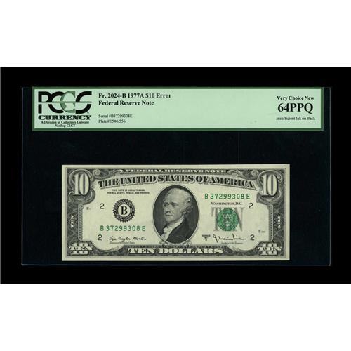 <B>Fr. 2024-B $10 1977A Federal Reserve Note. PCGS Very Choice New 64PPQ.</B></I><BR>This is an interesting insufficient ink error that affects the back of this earlier $10 FRN.<BR><BR><b>Shipping:</b> Coin/Currency (<a target="_blank" href="http://www.heritageauctions.com/common/shipping.php">view shipping information</a>)