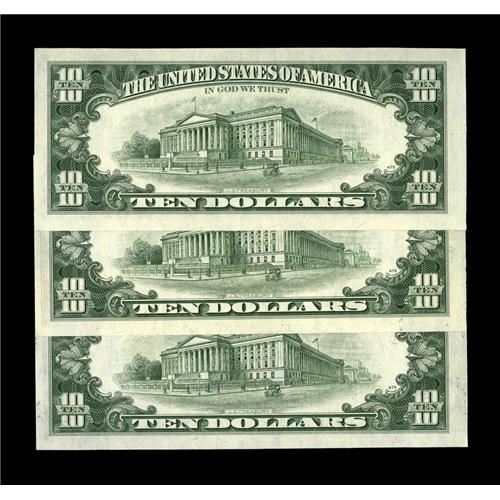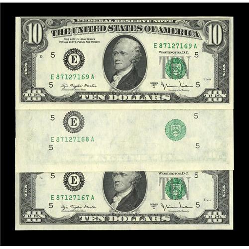 <B>Fr. 2024-E $10 1977A Federal Reserve Notes. Choice Crisp Uncirculated.</B></I><BR>The middle note of this trio is missing its entire first face printing. This error note is accompanied by its normal "bookend" siblings. "Bookends" are higly desirable when it comes to errors.<BR><BR><b>Shipping:</b> Coin/Currency (<a target="_blank" href="http://www.heritageauctions.com/common/shipping.php">view shipping information</a>)