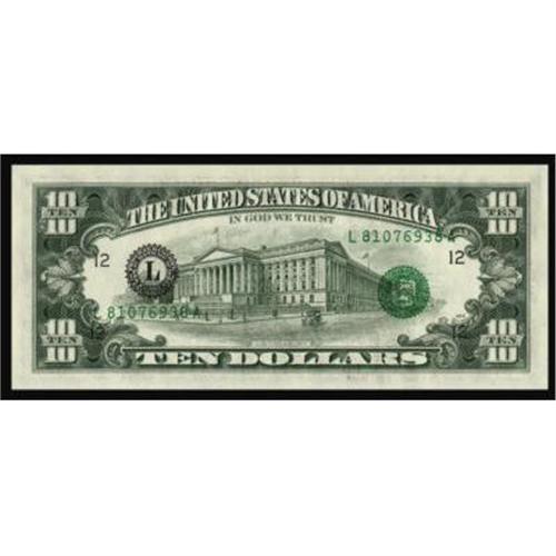 Fr. 2024-L. 1977A $10 Federal Reserve Note. ERROR-Overprint on Back. CGA Gem Uncirculated 66.