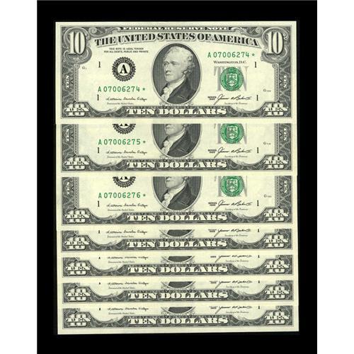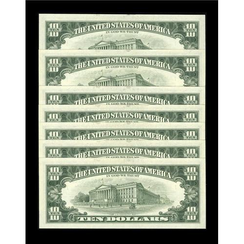 <B>Fr. 2027-A* $10 1985 Federal Reserve Notes. Seven Consecutive Examples. Gem Crisp Uncirculated.</B></I><BR>Original paper surfaces and nice centering highlight this mini-run of stars.<BR><BR><b>Shipping:</b> Coins & Currency (<a target="_blank" href="http://www.heritageauctions.com/common/shipping.php">view shipping information</a>)