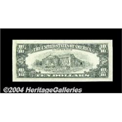 Fr. 2027-B $10 1985 Federal Reserve Note. Gem Crisp Uncirculated. The district seal and numbers are shifted very substantially down. <BR><BR><B>Important notice:</B> Heritage usually auctions material at the rate of 200-250 lots per hour. On some occasions eBay Live bid software or the Internet may not be able to keep up with the pace of the auction. We recommend placing a realistic absentee bid now as insurance to avoid disappointment. Occasionally the auctioneer may eliminate or reject an eBay Live bid, and the auctioneer may also reopen a lot after the close of the eBay live bidding (usually because we missed an audience bid), and may reject your bid even if it shows you as the winning bidder. By bidding via eBay Live, you agree that Heritage may award the lot to another bidder at its sole discretion under the circumstances described above or any other reasonable circumstances. Since eBay bids are not shown to us until we open the lot on the floor, we treat those bids just like floor bids. In most cases the floor responds before the eBay bid is presented to us, due to Internet lag time, so for consistency we have made it a policy that floor bids are always considered first over tie eBay live bids. Also please note that all Heritage lots purchased through eBay Live carry a 20% Buyer's Premium. Please make sure you read the Terms and Conditions before you bid. <BR><BR><B>IMPORTANT ANNOUNCEMENT ABOUT RESERVES:</B> Heritage now divulges all reserves on its web site 7 days before every auction. If you want to know whether the reserve on this lot has been met, and if not, what the reserve amount is, please visit this lot page on the HeritageCoin.com web site, or email: bid@HeritageGalleries.com