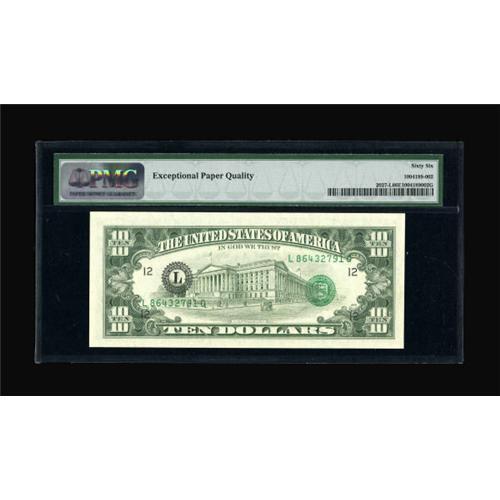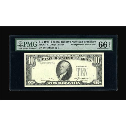 <B>Fr. 2027-L $10 1985 Federal Reserve Note. PMG Gem Uncirculated 66 EPQ.</B></I> A gorgeous third printing on reverse example graded Gem Uncirculated 66 EPQ by PMG. <BR><BR><b>Shipping:</b> Coins & Currency (<a target="_blank" href="http://www.heritageauctions.com/common/shipping.php">view shipping information</a>)