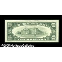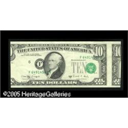 <B>Fr. 2028-F $10 1988A Federal Reserve Note. About Uncirculated.</B></I> The third printing is shifted far to the right on this miscut $10 that was once stapled to a piece of paper. Lot:15382