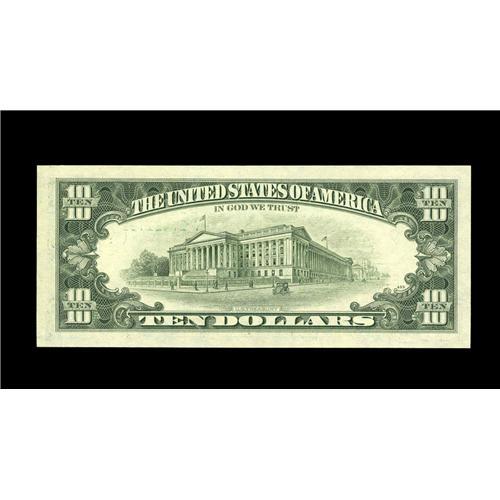 <B>Fr. 2028-F $10 1988A Federal Reserve Note. Gem Crisp Uncirculated.</B></I> Traces of the third printing are observed on the back of this Ten. The bold embossing tells us that this is an Atlanta note.