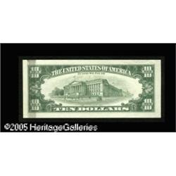 <B>Fr. 2028-L $10 1988A Federal Reserve Note. Choice New.</B></I><BR> The third printing and back printing are perfect, but the first face printing is shifted far to the left moving the district seal well into the portrait area and leaving a blank inch to the right. Lot:15383
