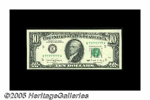 <B>Fr. 2029-E $10 1990 Federal Reserve Note. Gem Crisp Uncirculated.</B></I><BR>A gorgeous example bearing sold serial number E77777777A, easily pretty enough to realize...