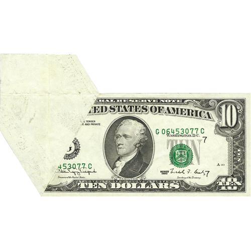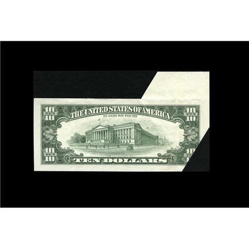 <B>Fr. 2029-G $10 1990 Federal Reserve Note. Crisp Uncirculated.</B></I><BR>This foldover error provides a huge blank area and some extra security strip. Also the third printing is a bit shifted. Since the only fold seen is across the top and done at the BEP we are assigning the new grade.