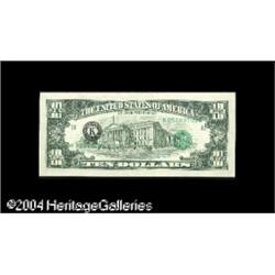 Fr. 2029-K $10 1988A Federal Reserve Note. About Unci <B>Fr. 2029-K $10 1988A Federal Reserve Note. About Uncirculated.</B></I> Third printing on reverse. <BR><BR><B>Important notice:</B> Heritage usually auctions material at the rate of 200-250 lots per hour. On some occasions eBay Live bid software or the Internet may not be able to keep up with the pace of the auction. We recommend placing a realistic absentee bid now as insurance to avoid disappointment. Occasionally the auctioneer may eliminate or reject an eBay Live bid, and the auctioneer may also reopen a lot after the close of the eBay live bidding (usually because we missed an audience bid), and may reject your bid even if it shows you as the winning bidder. By bidding via eBay Live, you agree that Heritage may award the lot to another bidder at its sole discretion under the circumstances described above or any other reasonable circumstances. Since eBay bids are not shown to us until we open the lot on the floor, we treat those bids just like floor bids. In most cases the floor responds before the eBay bid is presented to us, due to Internet lag time, so for consistency we have made it a policy that floor bids are always considered first over tie eBay live bids. Also please note that all Heritage lots purchased through eBay Live carry a 20% Buyer's Premium. Please make sure you read the Terms and Conditions before you bid. This lot is being auctioned in conjunction with a live floor auction by Heritage Galleries & Auctioneers. All final auction and invoice information will be supplied by Heritage Galleries & Auctioneers, and all other information should be considered preliminary. Lot:16088
