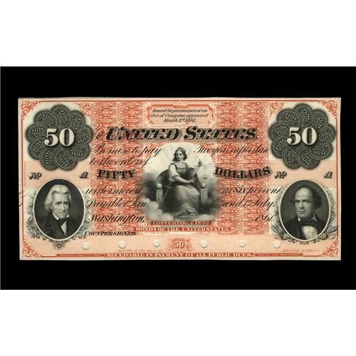 <B>Fr. 202a Hessler 945b $50 1861 Interest Bearing Note Face Proof Gem New.</B></I> This design type is one of the rarest in United States paper money. It is represented by a single signed and issued redeemable example, which we have sold twice, the last time in February 2005 for $368,000. That note, and another issued note, which has been punch cancelled, redeemed and now resides in the Bureau of the Public Debt in Washington DC, are all that are listed in the census of issued notes. Hessler also records three face and back proofs on thin paper in his proof census, but there is no mention of a face proof only example. In fact, we sold Jim O'Neal's dual sided proof example for $25,300 in May 2005. The plate A uniface proof presented here is printed on card stock with a thin card backing, and there are six POCs found in the signature block. This sharply printed and colorful proof of a major rarity will certainly be a highlight for the next collection it enters.<BR><I>From the California Proof and Specimen Collection.</B></I>