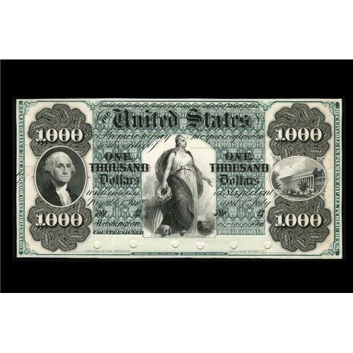 <B>Fr. 202d Hessler 1393b $1000 1861 Interest Bearing Note Face Proof Gem New, PC.</B></I> There are no issued notes for this design known, and in fact Friedberg mentions only one complete proof in existence. We sold that proof as part of the Jim O'Neal Collection in May 2005 for $37,375. This plate letter C face proof is printed on India paper and mounted on card stock. It also has six punch cancels along the signature blocks. For face proofs, the Hessler reference only mentions a single plate A note. This noble proof will surely create a stir in the auction room tonight.<BR><I>From the California Proof and Specimen Collection.</B></I>