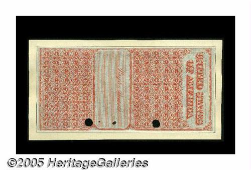 <B>Fr. 202d Hessler X126I (1393b) $1000 1861 Interest Bearing Note Proof Gem New, PC.</B></I> There are no issued notes for this design known, and in fact this is the only complete proof in existence. This plate letter A proof with two punch cancels hails from the sale of the fabled Vattemare Collection, and it carries the familiar rim mounting of that collection. It also has a pencilled "1521" in the upper right-hand corner, and this notation corresponds with its lot number in Part II of the Vattemare sale. Serial number 3973 has been penned in red ink, while a couple of black ink drops reside on the back. An unusual aspect of this Friedberg plate note is that the blue-green central arch around the vignette of <I>America</B></I> is <B>inverted.</B></I> Surely, a trophy note if there ever was one, and destined to rest in another great collection.